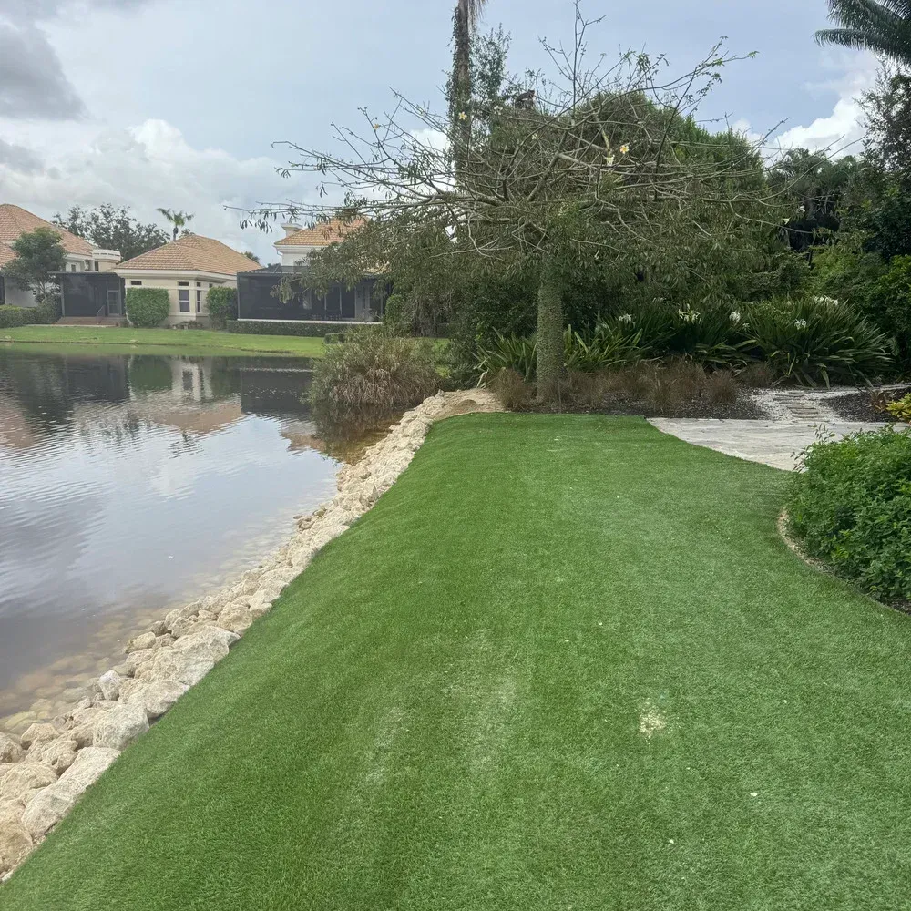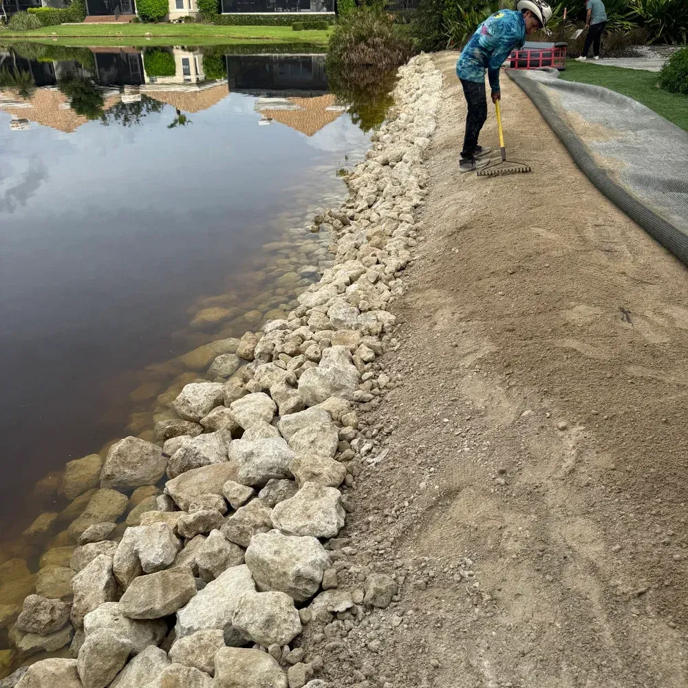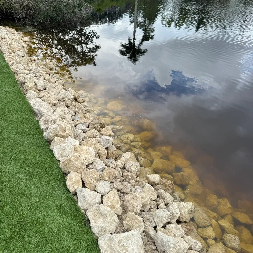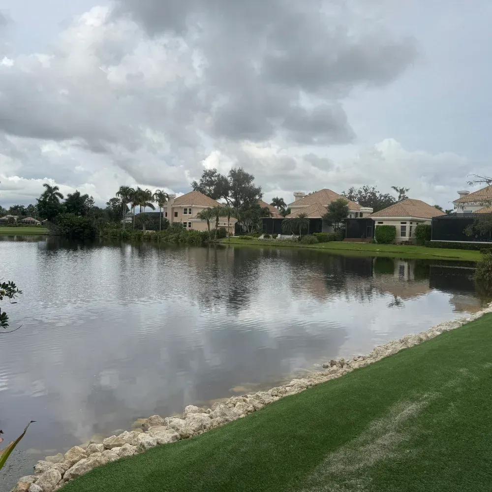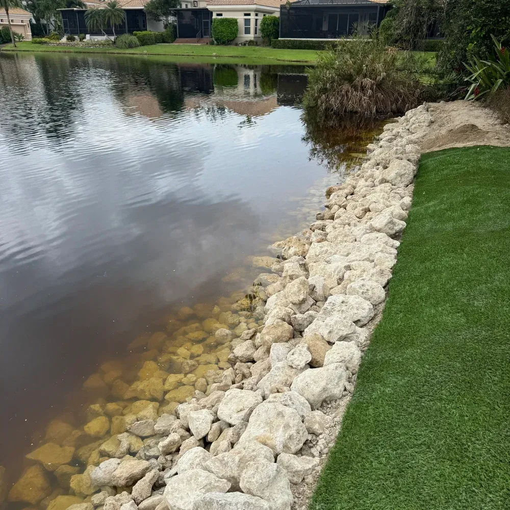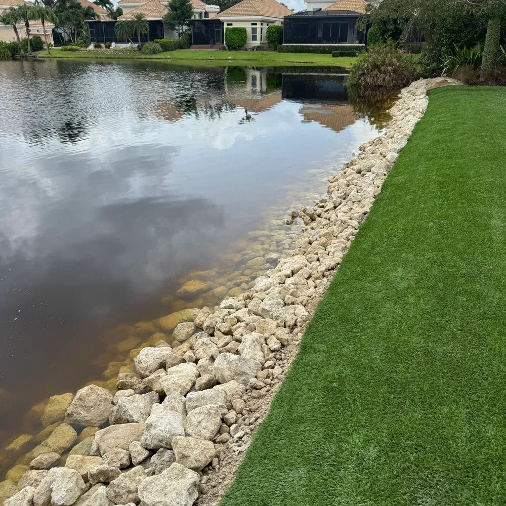 In this Naples, Florida property, the existing seawall had begun to show signs of erosion and structural wear along the lake’s edge. Lush Lanais was brought in to completely remove the failing seawall, stabilize the shoreline, and restore the natural grade using a combination of riprap stone, drainage correction, and sod restoration.